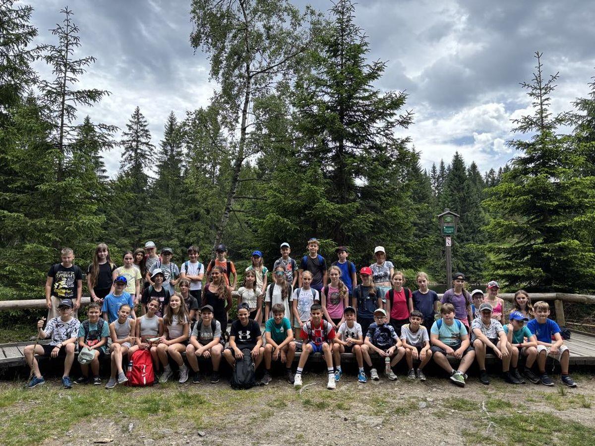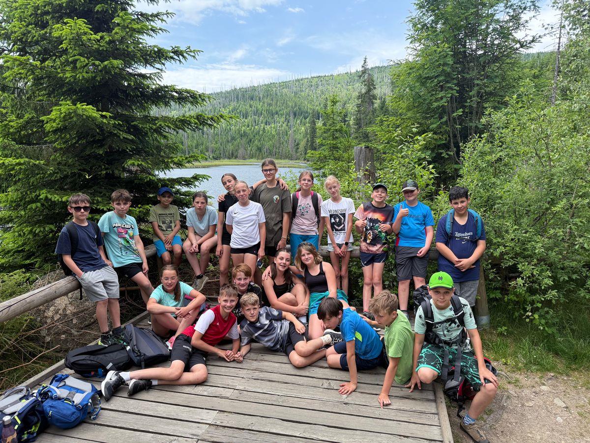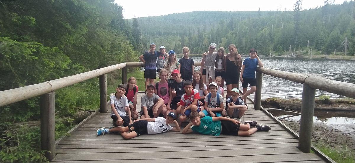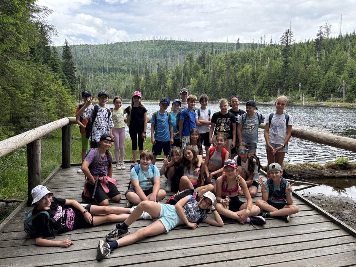 Předposlední den školního roku si třídy VI.C a VII.A připravily pro o rok mladší spolužáky stopovanou šumavskou krajinou. Páťáci startovali z parkoviště na Nové Hůrce, šli přes Bukovinu a Rudský rozcestník až k ledovcovému jezeru Laka. Cestou k autobusu se zastavili u kaple sv. Kříže, kde se dočkali sladké odměny.